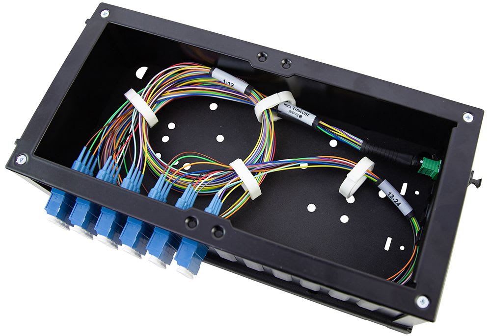 Foss Veggboks 11 med MPO leveres komplett med adapter, MPO fan-out og er ferdig montert. Boksene er laget slik at det skal være raskt og enkelt å arbeide i dem, samtidig som de skal kunne tilpasses en rekke forskjellige behov.